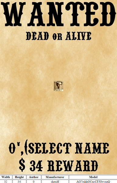 INSERT INTO wanted (width, height, author, manufacturer, model) VALUES ('image width', 'image height', 'value of name', 'value of manufacturer', 'value of model')Let's try to inject our own values for the Author, Manufacturer and Model column: